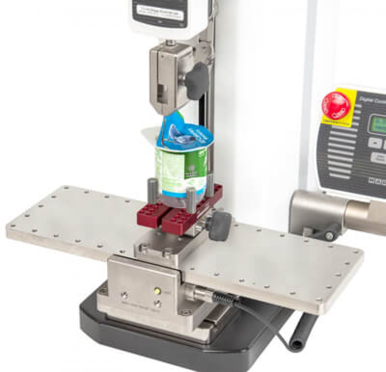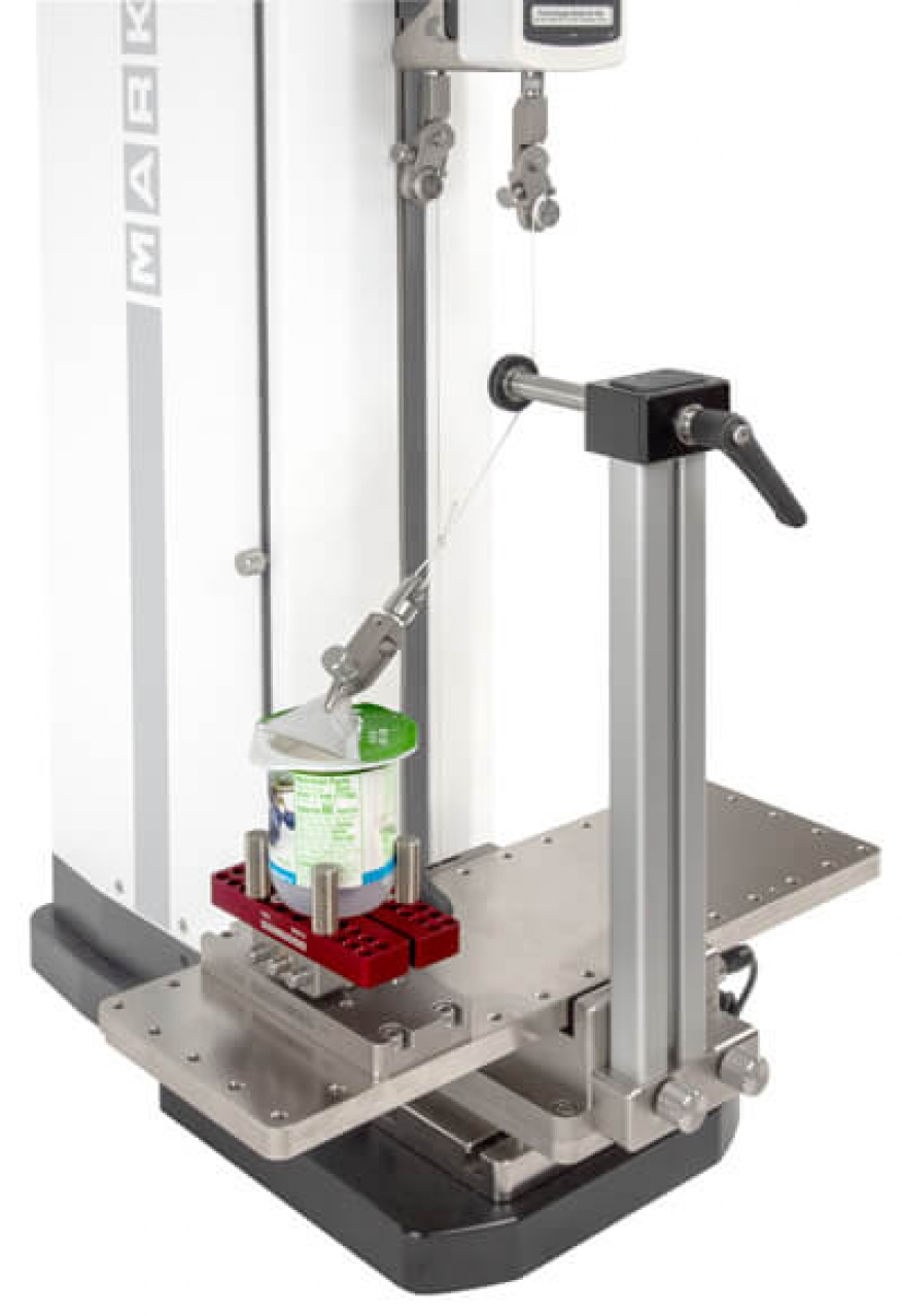 Un altro adattatore (opzionale) utilizza una puleggia per regolare l'angolo di tiro da 0° a 90°, mentre il piano di lavoro resta orizzontale. Questa configurazione è adatta per eseguire prove di tenuta su contenitori pieni, ma può essere utilizzato anche per nastri e altri materiali.