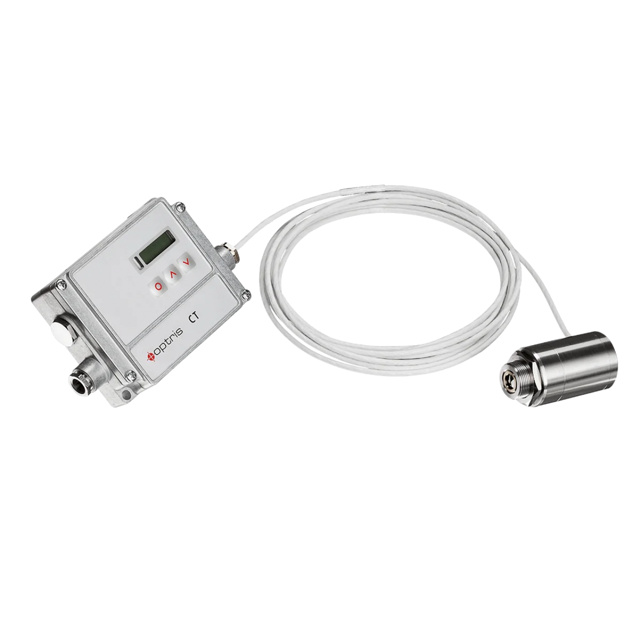 Termometro a infrarossi per film plastici sottili e vetro con elettronica separata, tasti di programmazione e display.