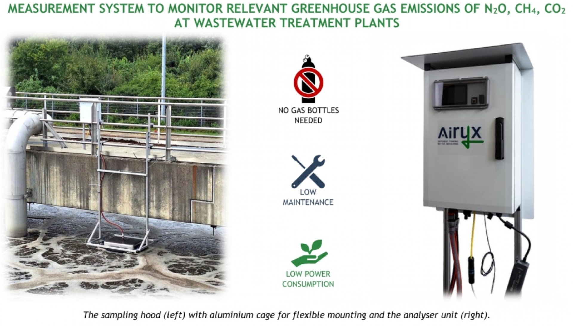 Il WGA020 di Airyx è un analizzatore di gas progettato per il monitoraggio in tempo reale delle emissioni di N₂O, CH₄, CO₂ e O₂ nei bacini di denitrificazione degli impianti di trattamento delle acque reflue. Grazie alla tecnologia brevettata Airyx, il sistema garantisce misurazioni stabili e accurate con minima manutenzione, non necessita di nessuna bombola gas integrata ed è in grado di svolgere una stima precisa delle emissioni nette distinguendo tra emissioni di fondo e quelle legate ai processi.