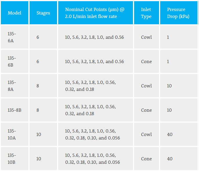 Gli impattatori Mini-MOUDI™ mod.135 sono impattori ad alta precisione con una portata di campionamento di 2,0 l/min e una dimensione fisica ridotta. Sono disponibili con 6, 8 e 10 stadi di impatto per fornire campioni di particelle frazionate in dimensioni a partire da soli 56 nm (come i tradizionali impattori MOUDI ™).